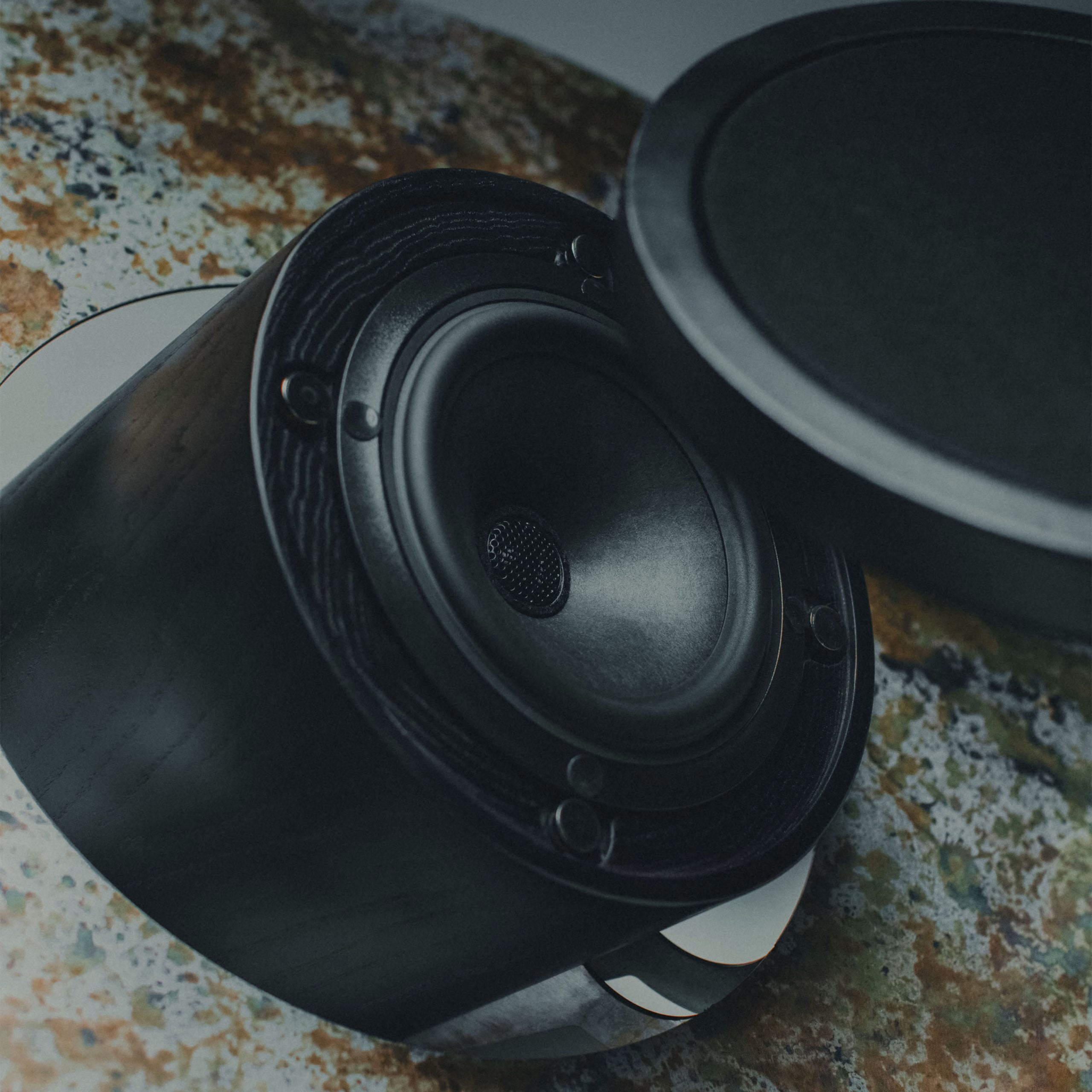Saturnia is a floor-standing speaker made of iron and ash wood.