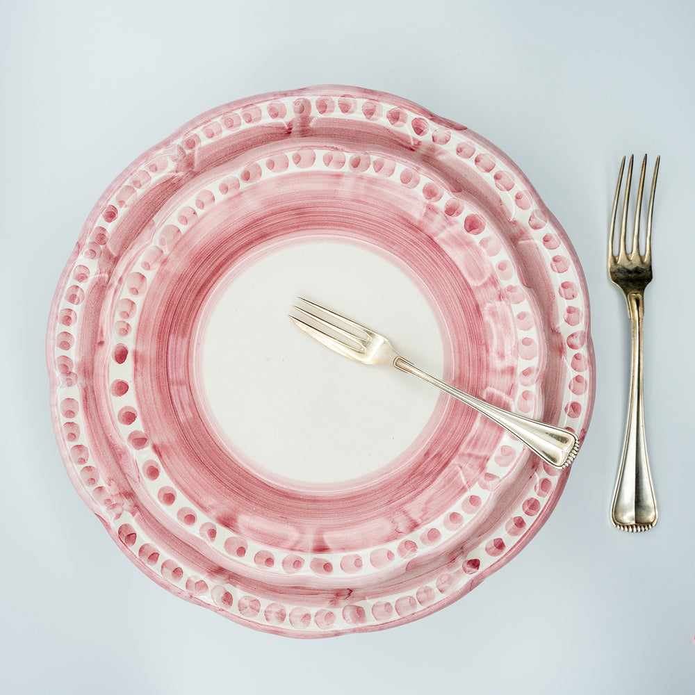 Piatto fondo I Colorati rosa apparecchiato, ceramica artigianale per servizio da tavola.