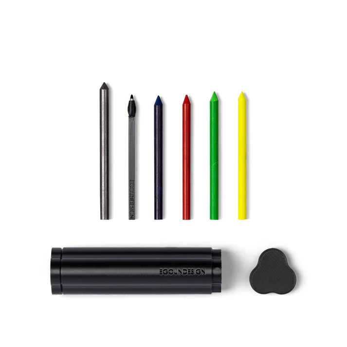 TRILObyME contains: – CENTO3.E multifunctional tool – 1 graphite refill – 1 black ballpoint pen refill – 2 colored wax crayons – 2 dry eraser markers – Sharpener – White eraser