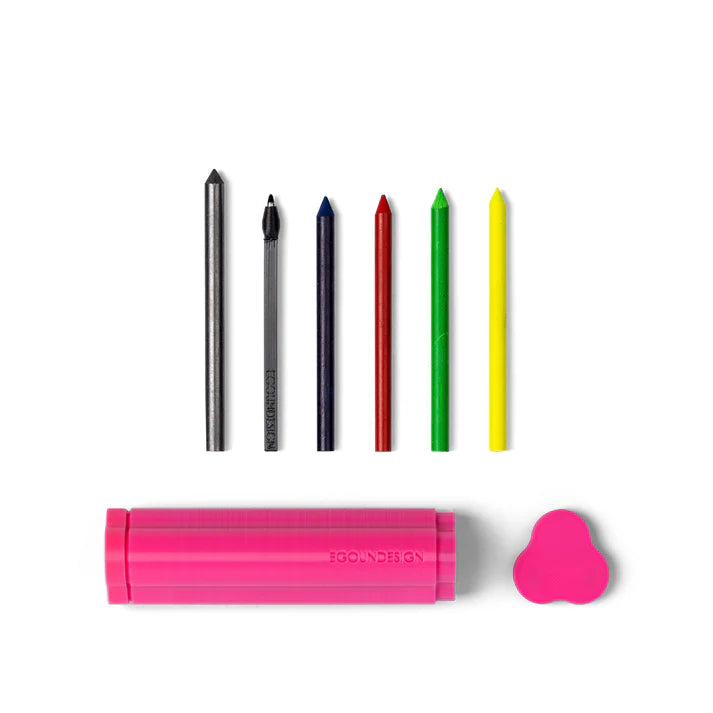 TRILObyME was born from the need to have all the 6 interchangeable functions by CENTO3: ballpoint pen with black ink, lead graphite, watercolor crayons in red and blue, dry eraser markers in yellow and green, as well as an eraser and sharpener. The pencil case closes with playful magnetic caps on both sides that can be swapped for a two-tone effect. The pen is characterized by its compact size, the ergonomic trilobate shape—a tribute to the CENTO3 signature—, zero-waste 3D printing using FDM (Fused Deposition Modeling) technology, and the material used—PLA (polylactic acid)—derived from renewable and plant-based raw materials, compostable, biodegradable, and exceptionally versatile.