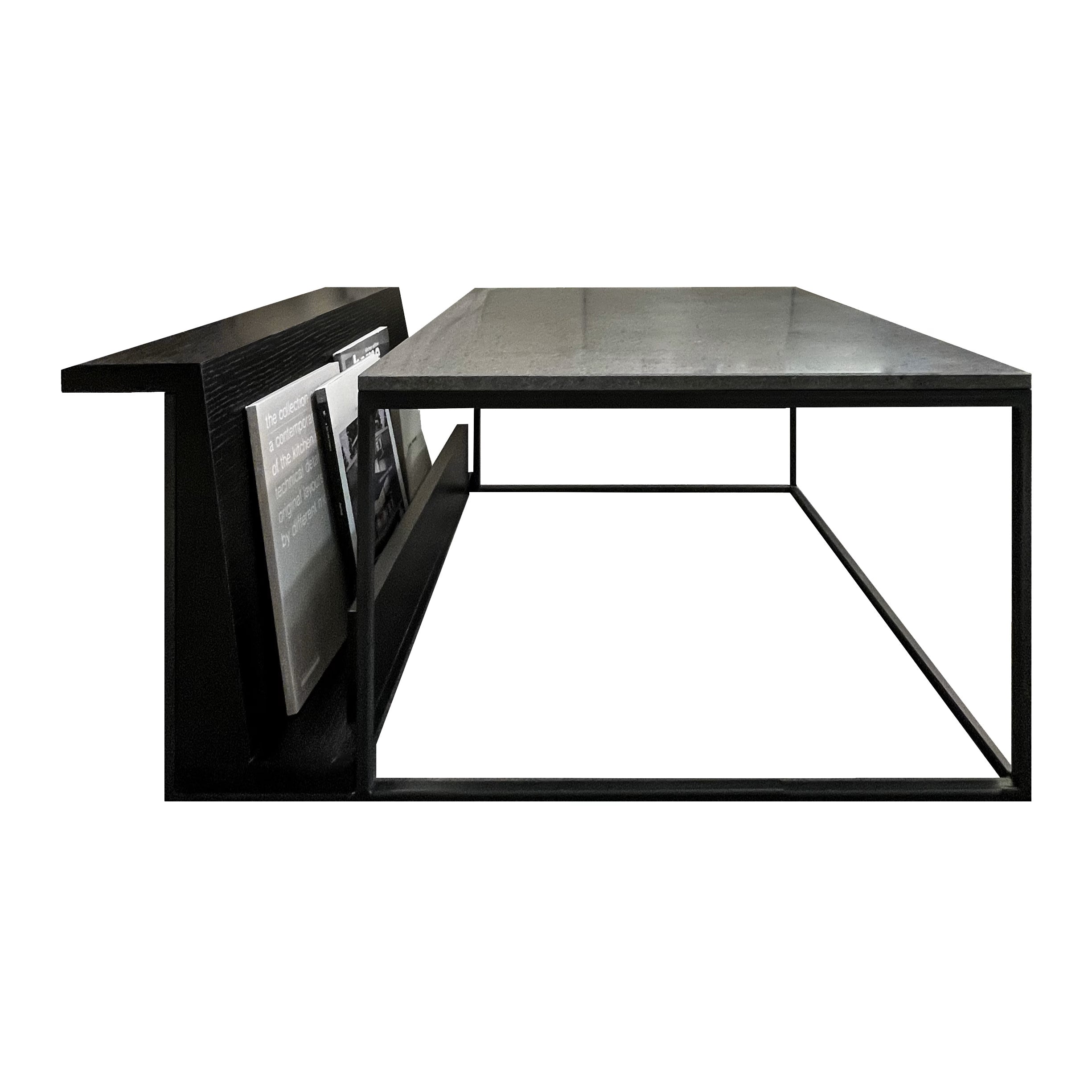 Sled is a coffee table with a solid painted steel structure and a marble top, designed with a dual function: to support the marble top and to accommodate an oak magazine rack.