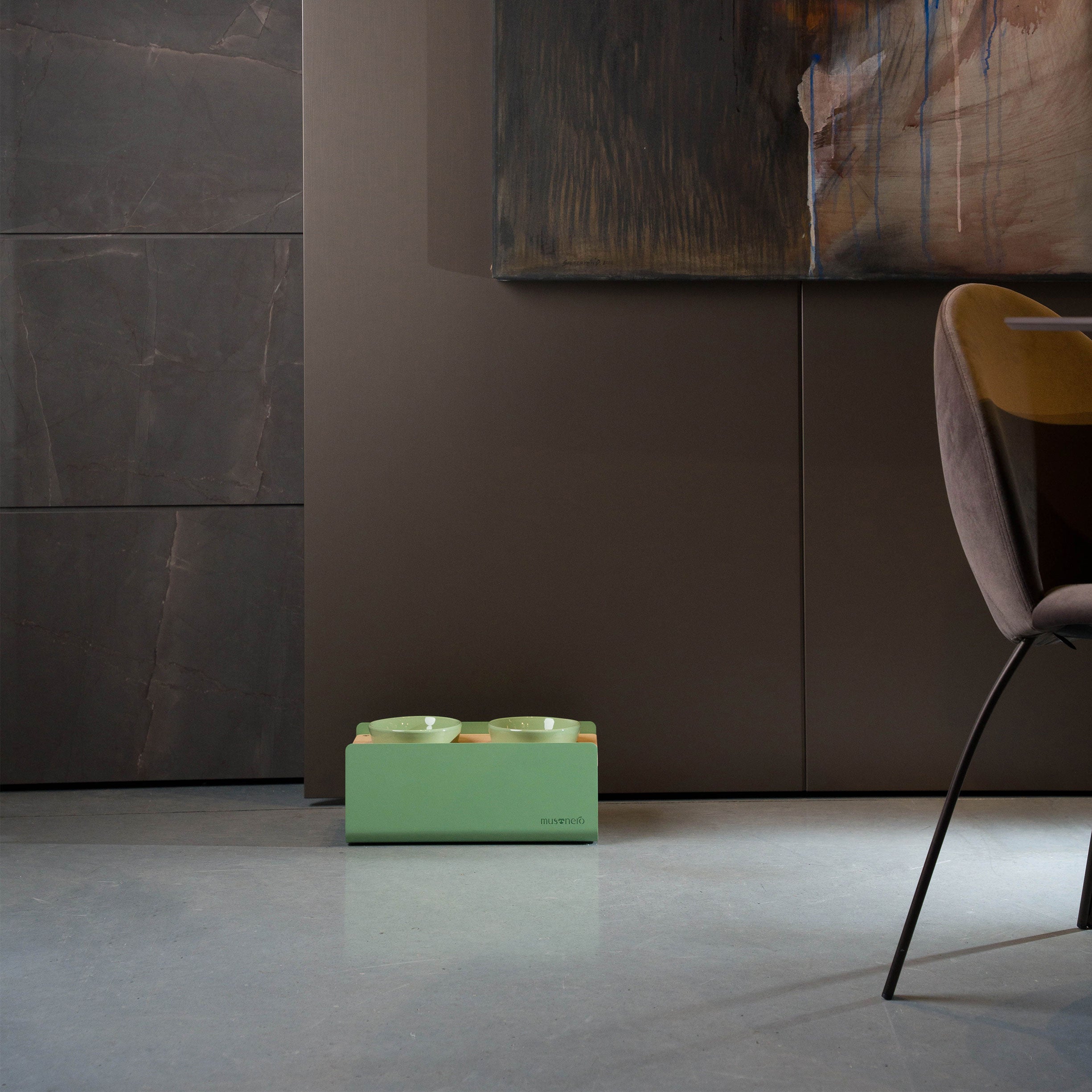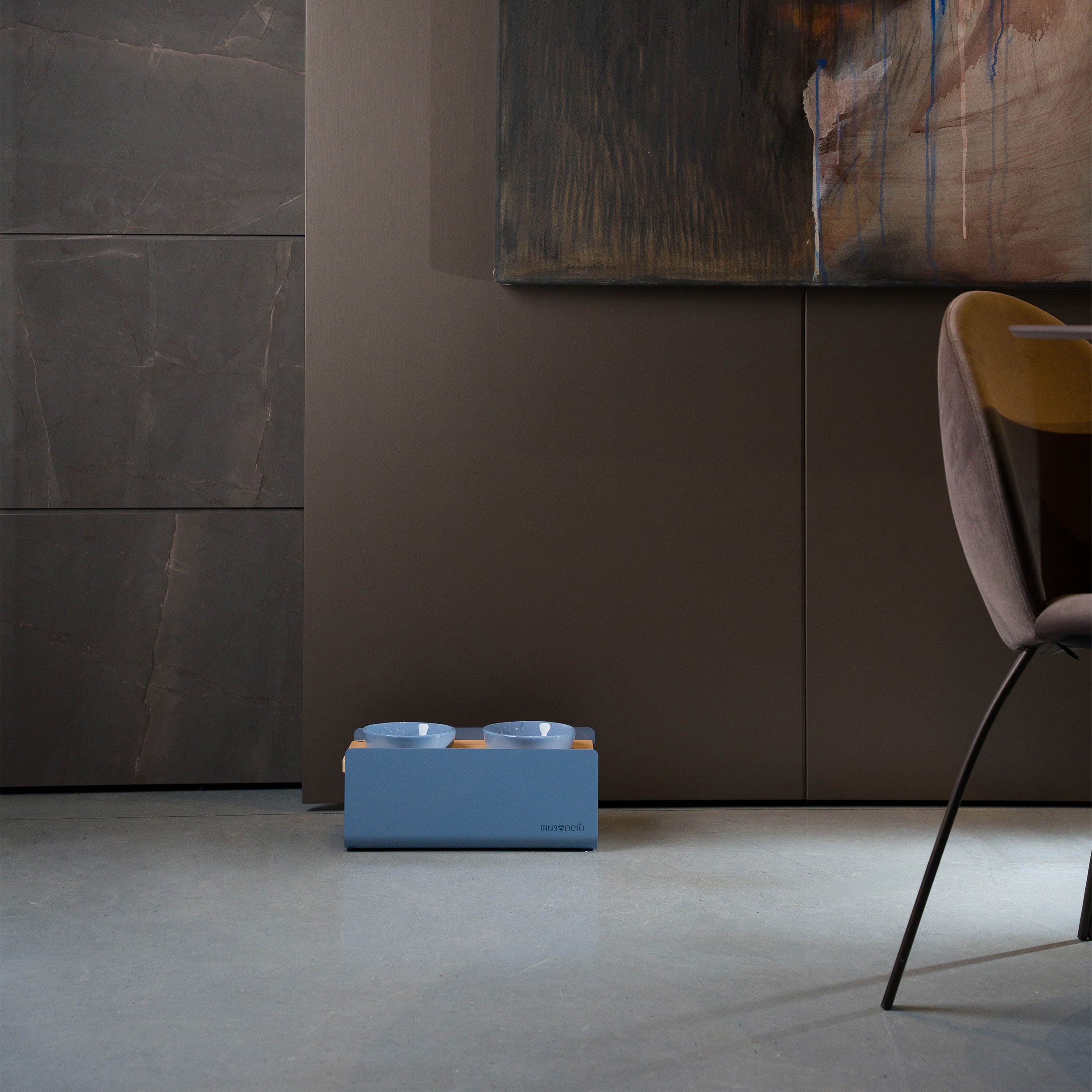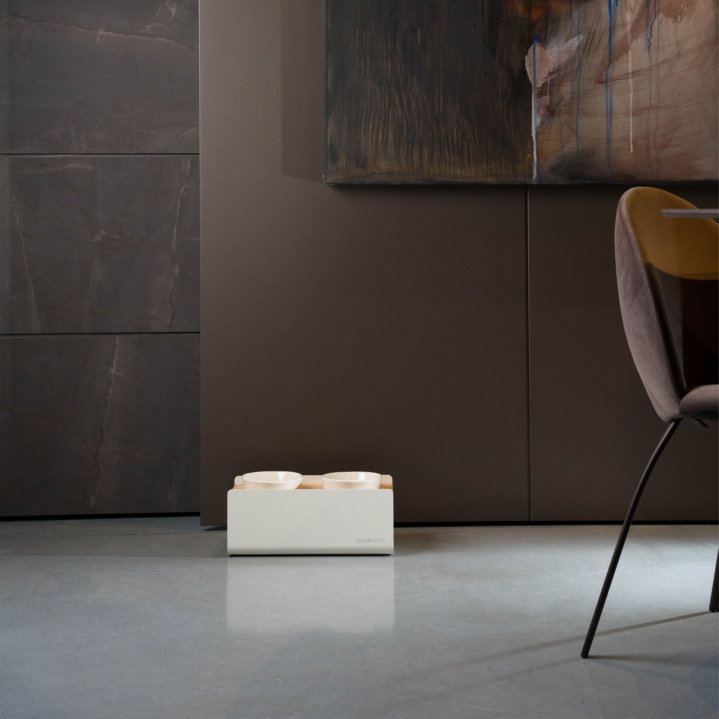 This dog bowl stand features a sturdy painted metal frame, a natural beech wood top, and removable enamelled ceramic bowls. The elevated design keeps food and water at a comfortable height, reducing strain on your dog’s neck while keeping the feeding area clean and organized.