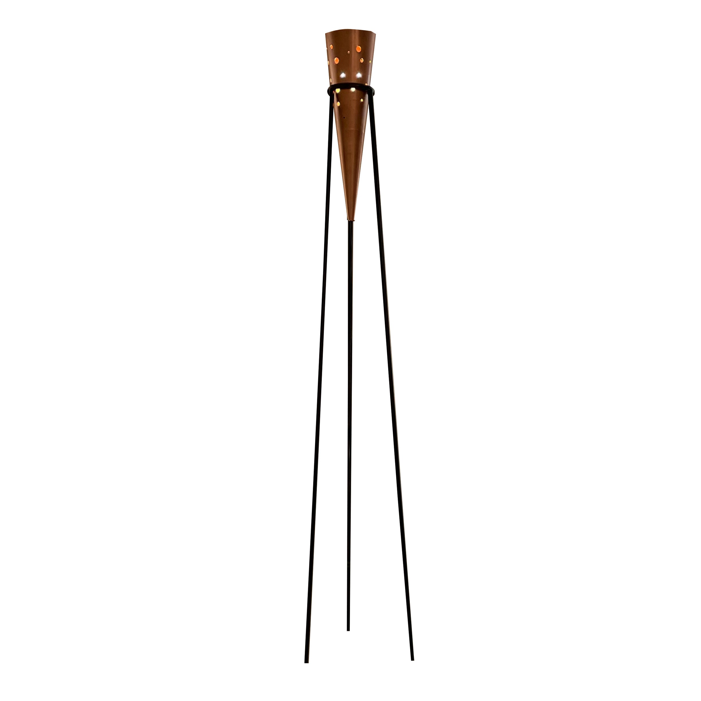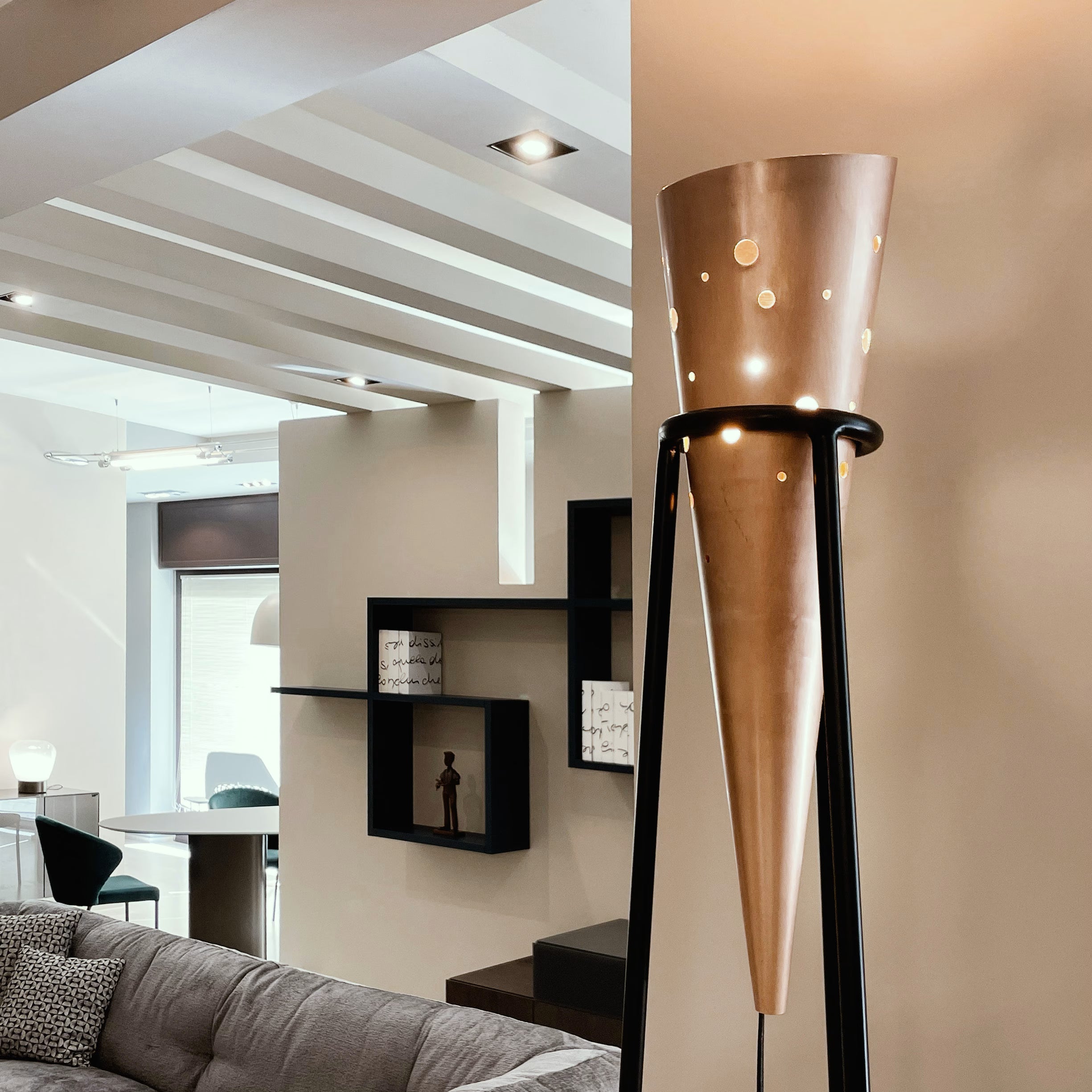 Cartoccio is a floor lamp composed of a copper diffuser, the beating heart of the lamp and supported by three black steel legs