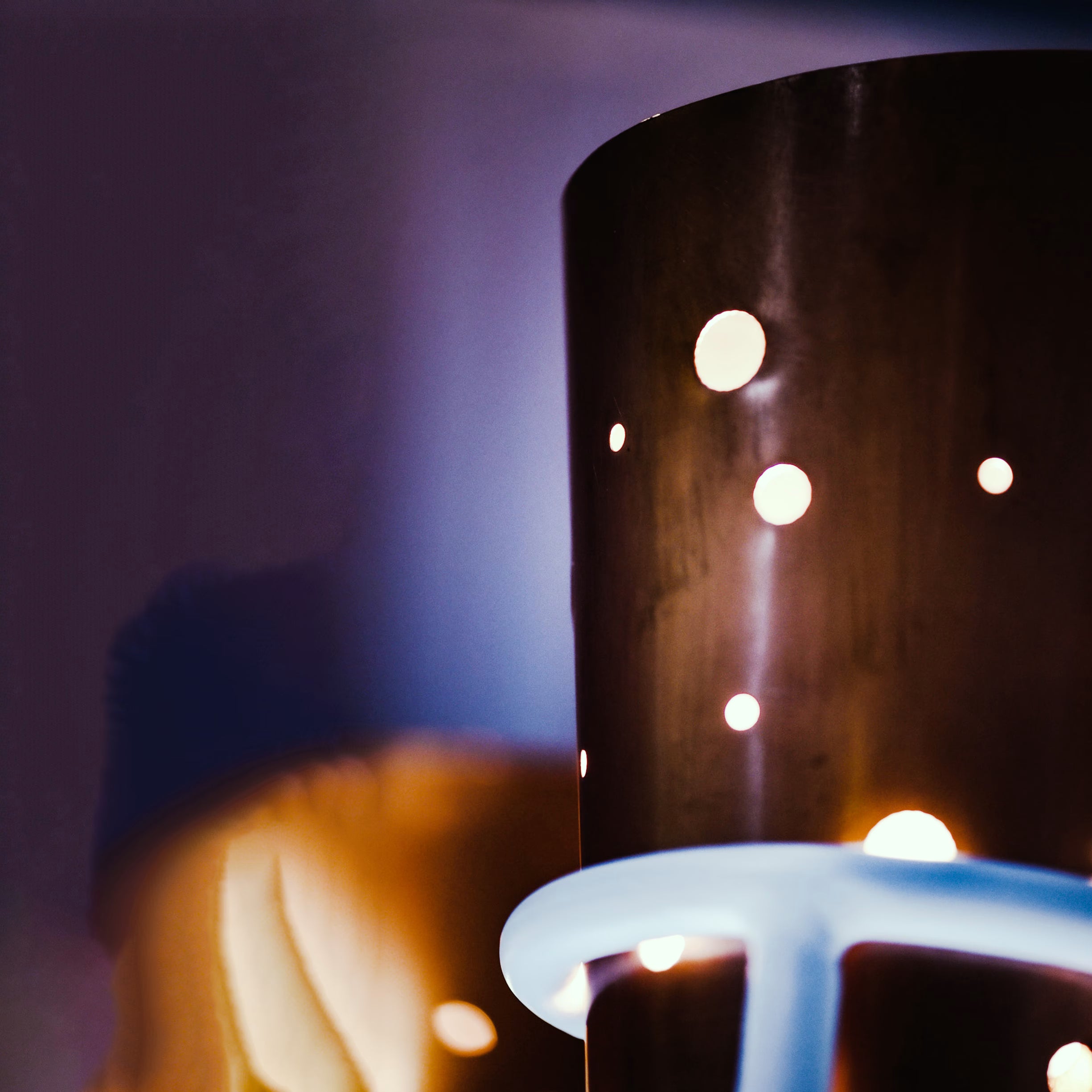 The first prototype remained hidden for a long time, as if waiting for the right time to reveal itself. Today, it presents itself in a contemporary guise, preserving the expressive power of the original design. The copper diffuser, the beating heart of the lamp, is supported by three steel legs that slenderize its silhouette, lending it majesty and elegance. The holes, distributed with varying diameters, generate a suggestive play of light and shadow that reflects in the room, creating a lively and welcoming atmosphere. The copper, with its warm hue, envelops the light and transforms it into a soft amber hue.