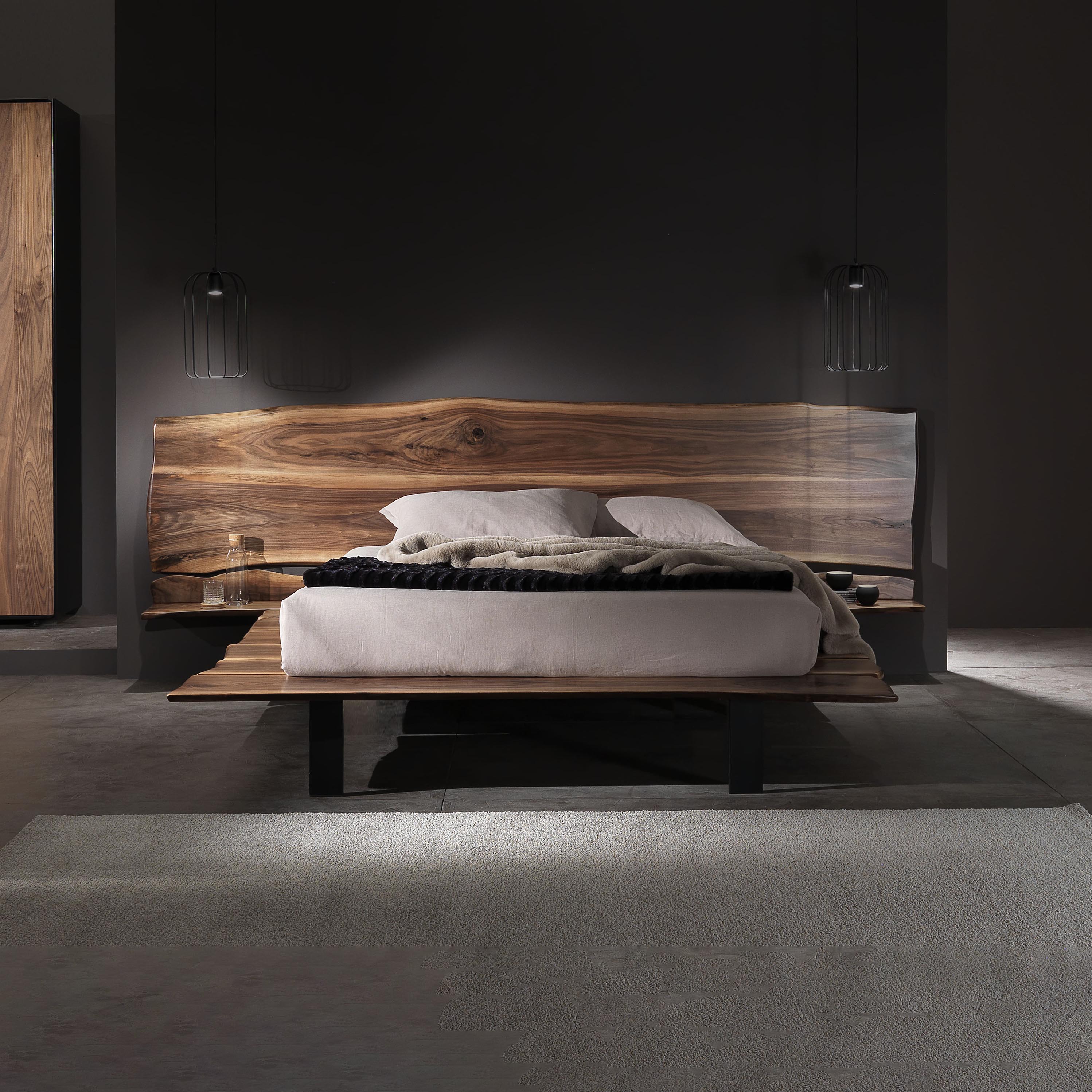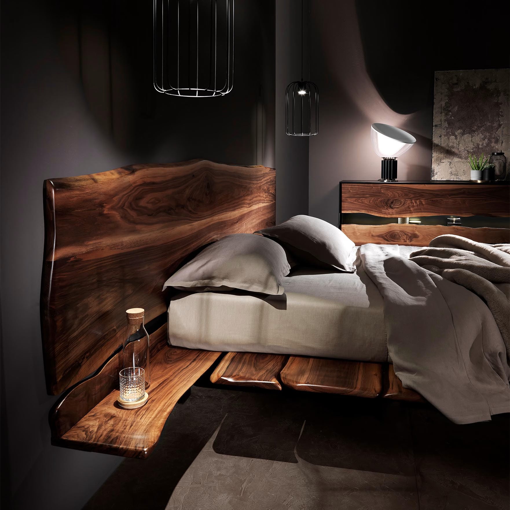 The bed is composed of a harmonious combination of planks, creating a highly natural and unique element. One of the bed's defining features is undoubtedly the bedside tables integrated into the headboard, a detail that lends continuity and importance. Its generous dimensions highlight the beauty and elegance of the wood, lending it a sculptural and majestic feel.