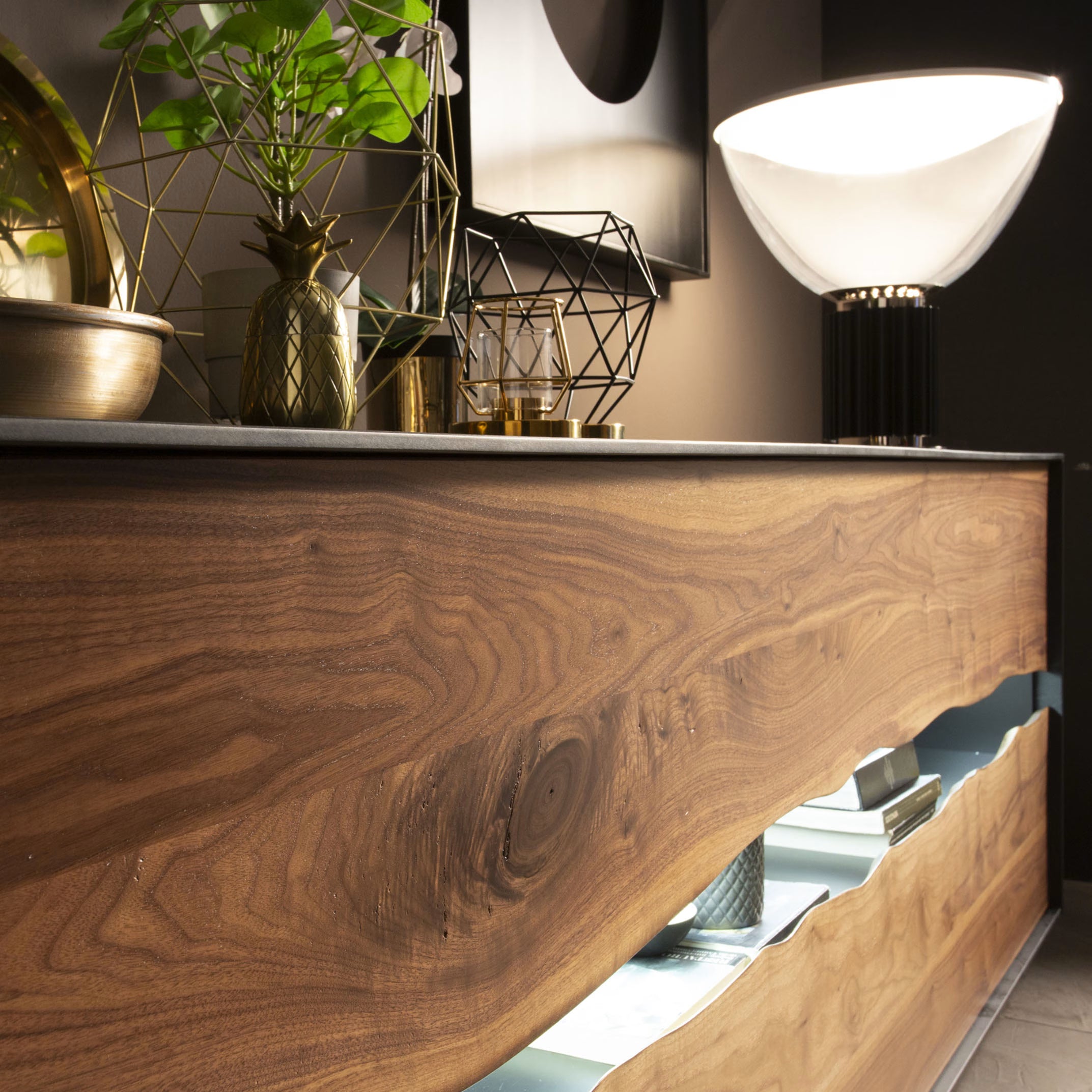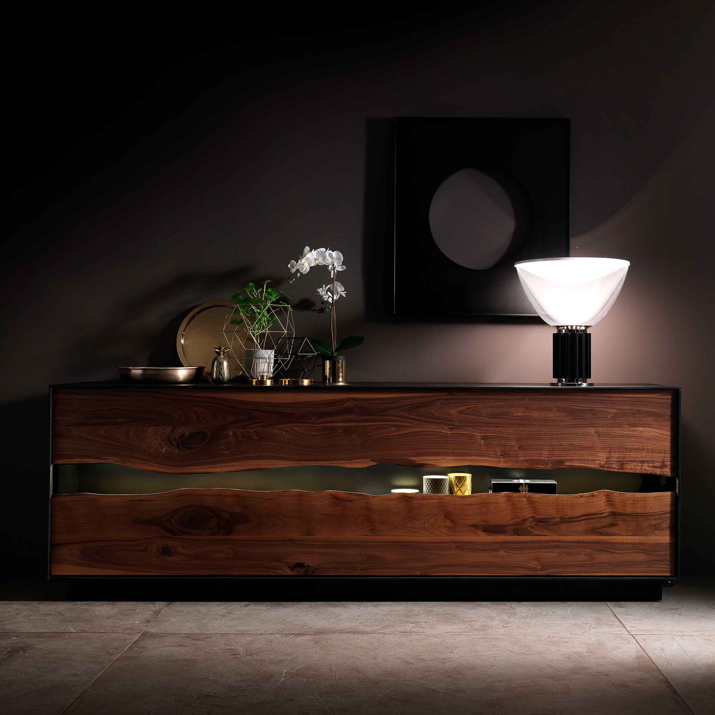A one-of-a-kind sideboard, its natural, refined lines elegantly transform any space. The piece is created by alternating two drawer spaces and an open storage space. The two majestic fronts are made entirely of solid wood planks, each containing two drawers made of Canaletto walnut veneered blockboard. The combination of Canaletto walnut planks, lacquer, and stone creates a perfect balance, and the integrated lighting lends the piece a theatrical beauty, allowing it to blend seamlessly into a wide variety of spaces, from bedrooms to living rooms, from offices to restaurants.