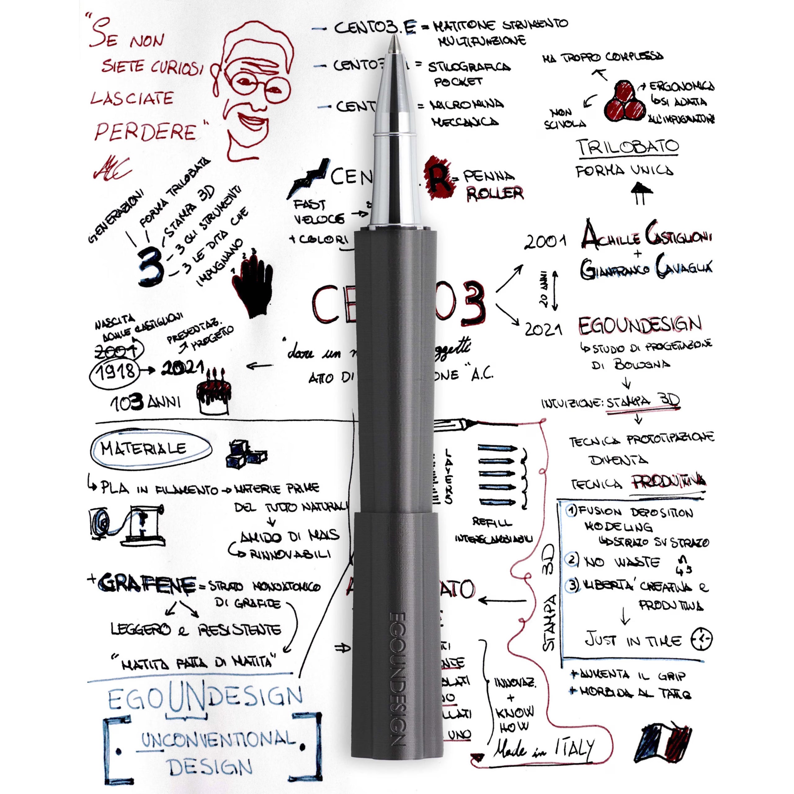 CENTO3 is a project dedicated to writing instruments, the last one designed in 2001 by Achille Castiglioni and Gianfranco Cavaglià, engineered and created in 2021 by Egoundesign, in collaboration with architect Cavaglià and the Achille Castiglioni Foundation. The name CENTO3 reflects the time elapsed between Castiglioni's birth (1918) and the presentation of the 2021 edition: 103 years. Furthermore, three is a recurring figure in the project: there are three partners, three generations, three types of writing instruments proposed, and three arches that define the object's characteristic trilobate shape.