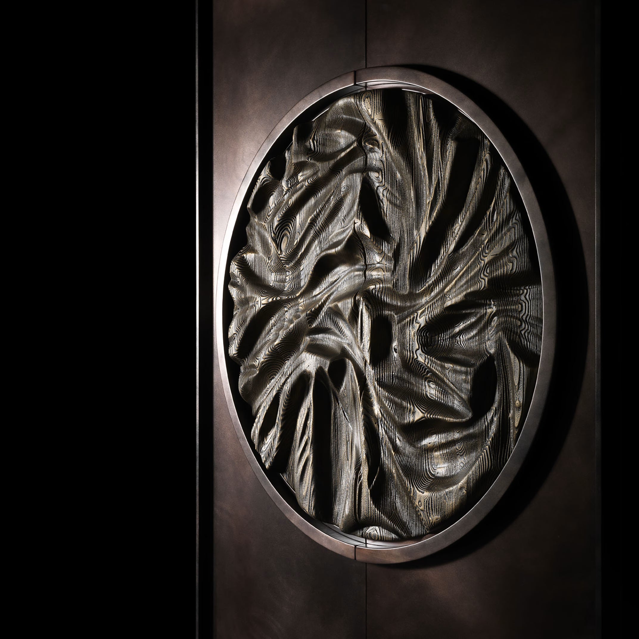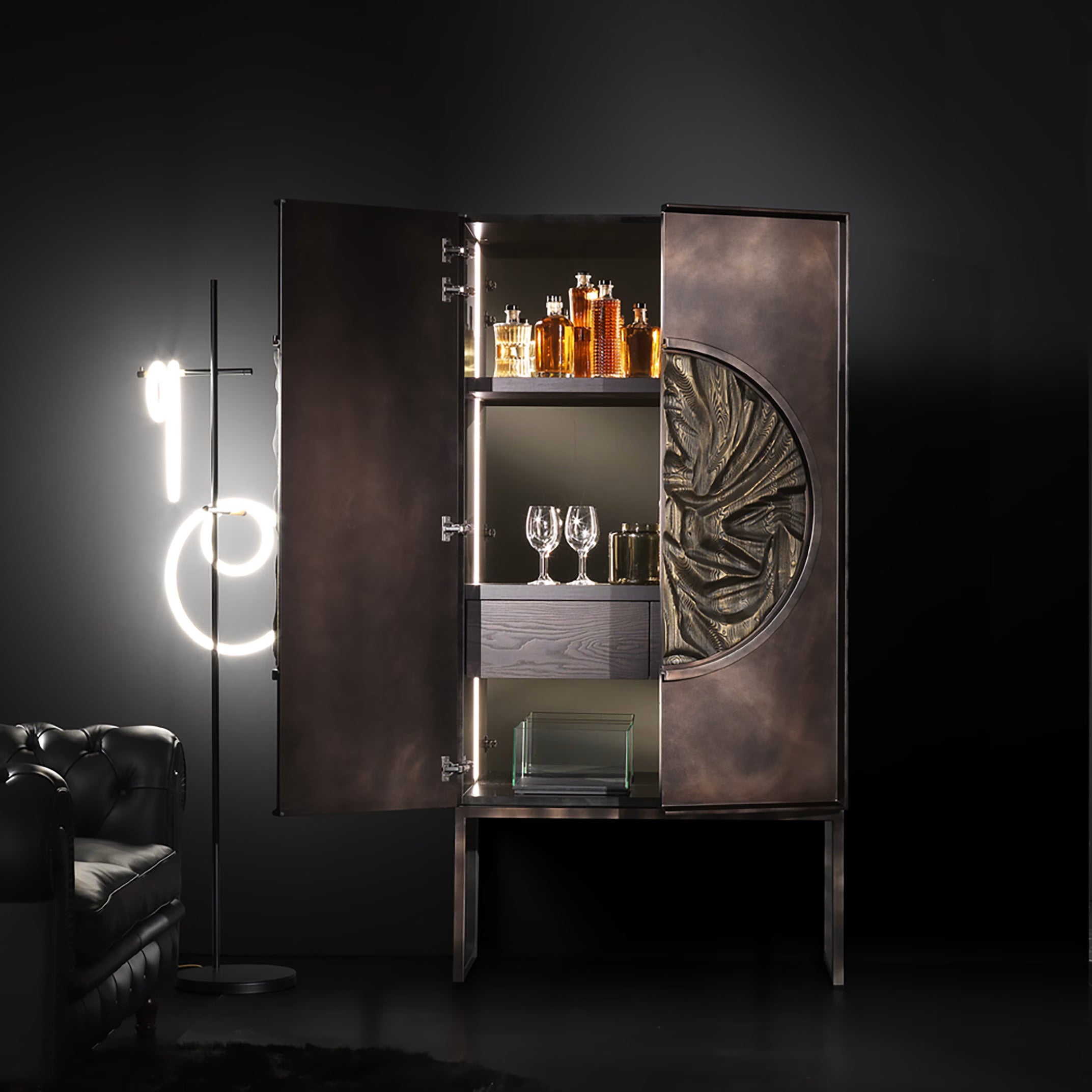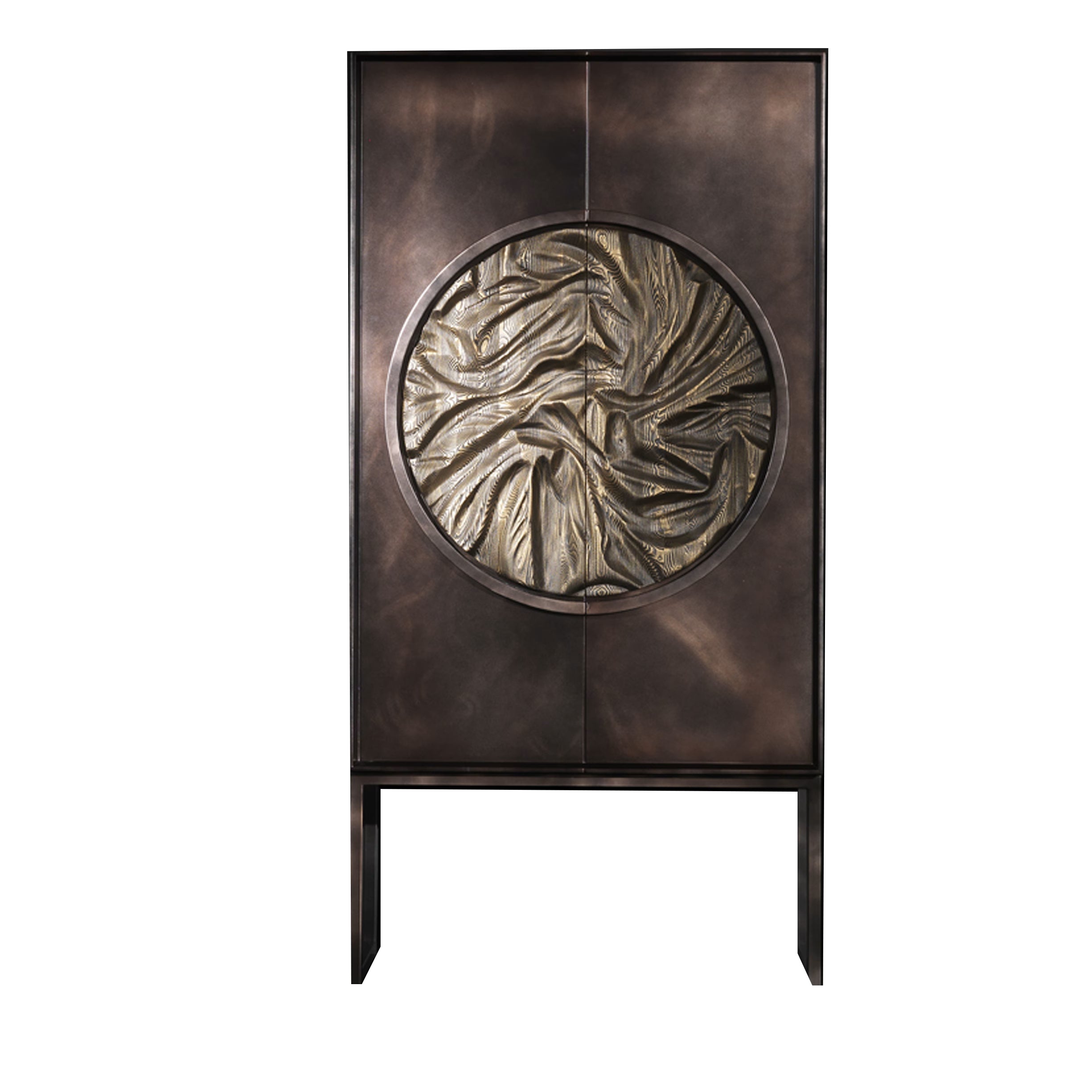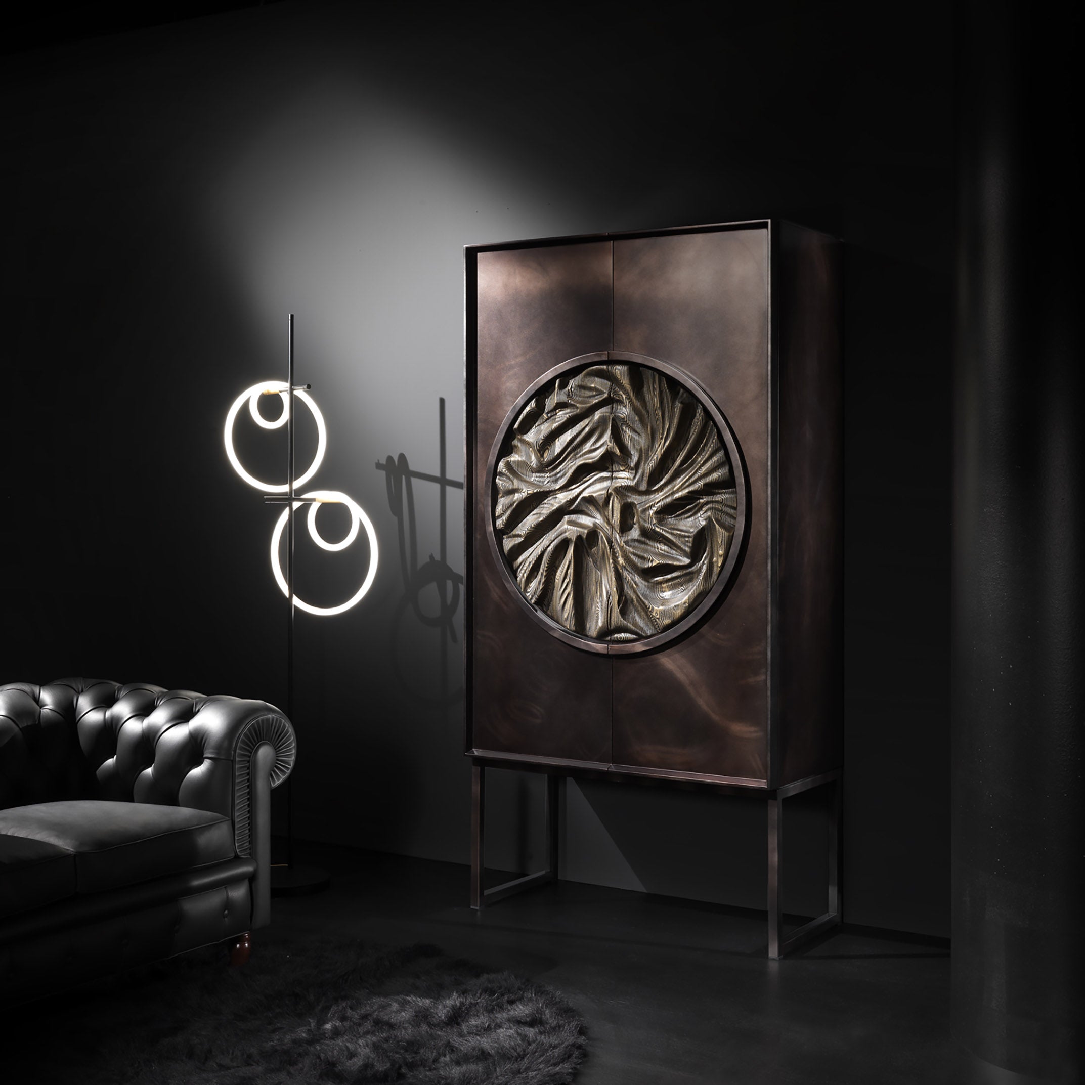The heart of this sideboard is its decorative centerpiece, a hand-carved wooden circle that creates the illusion of fabric. This extraordinary creation adds a tactile and visual dimension that transforms the sideboard into a work of art to be contemplated. The interior is elegantly enriched thanks to the balance of wood, bronzed mirror, and the theatricality of the LED light.