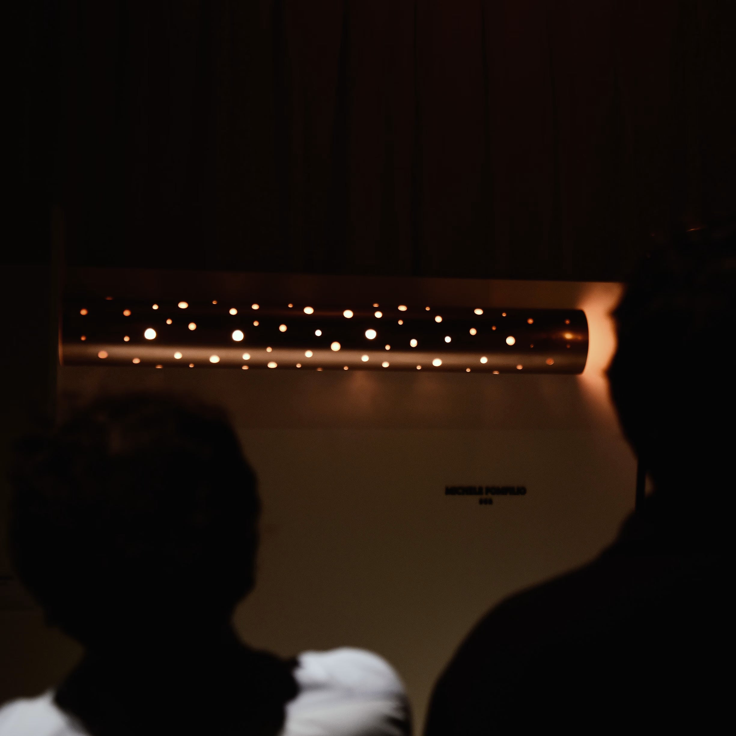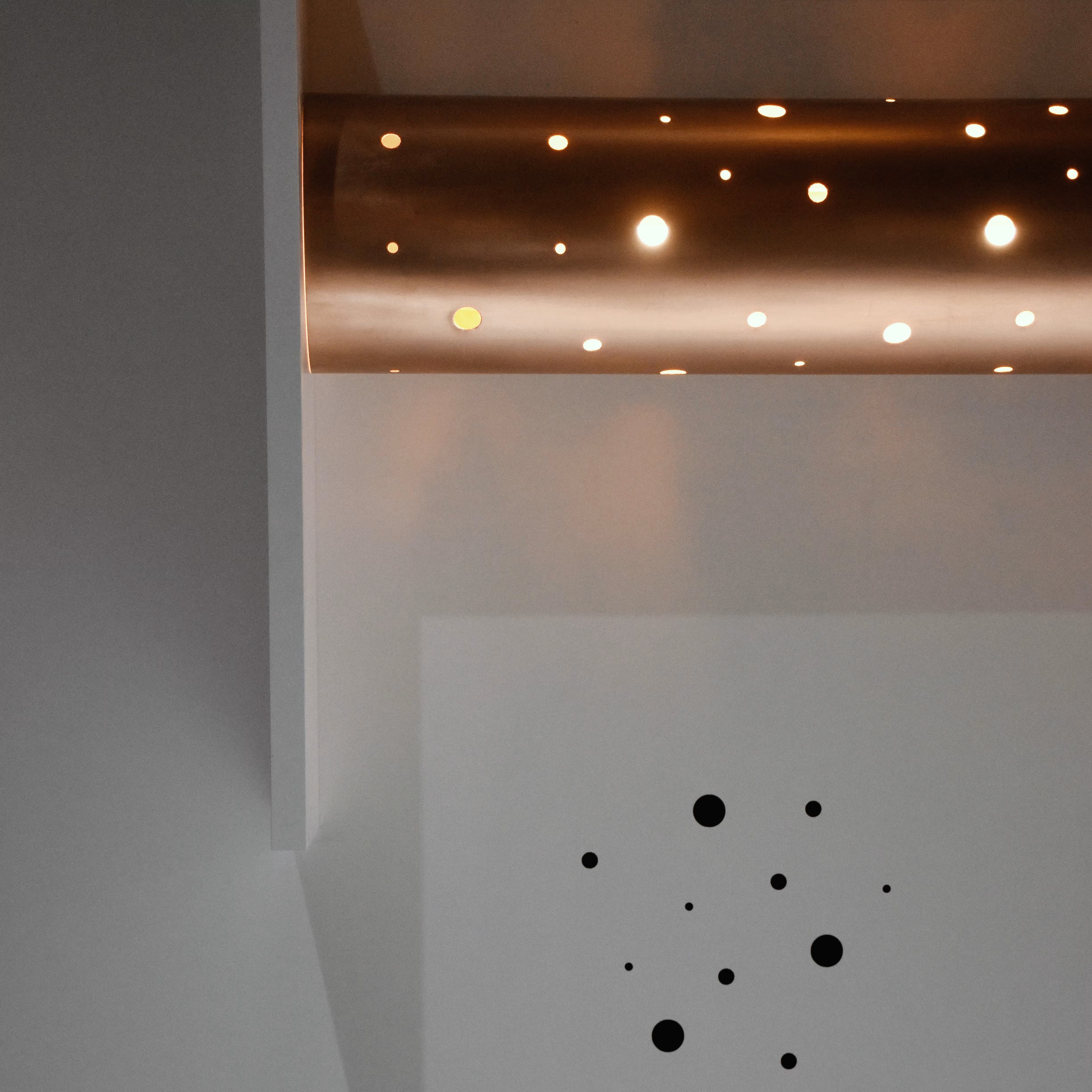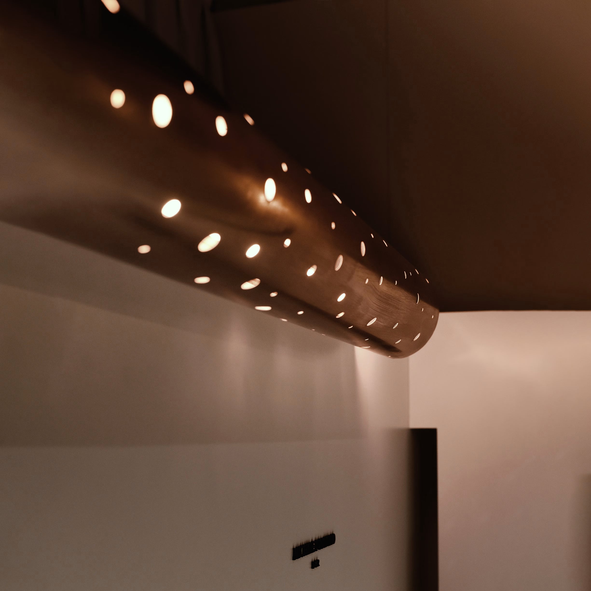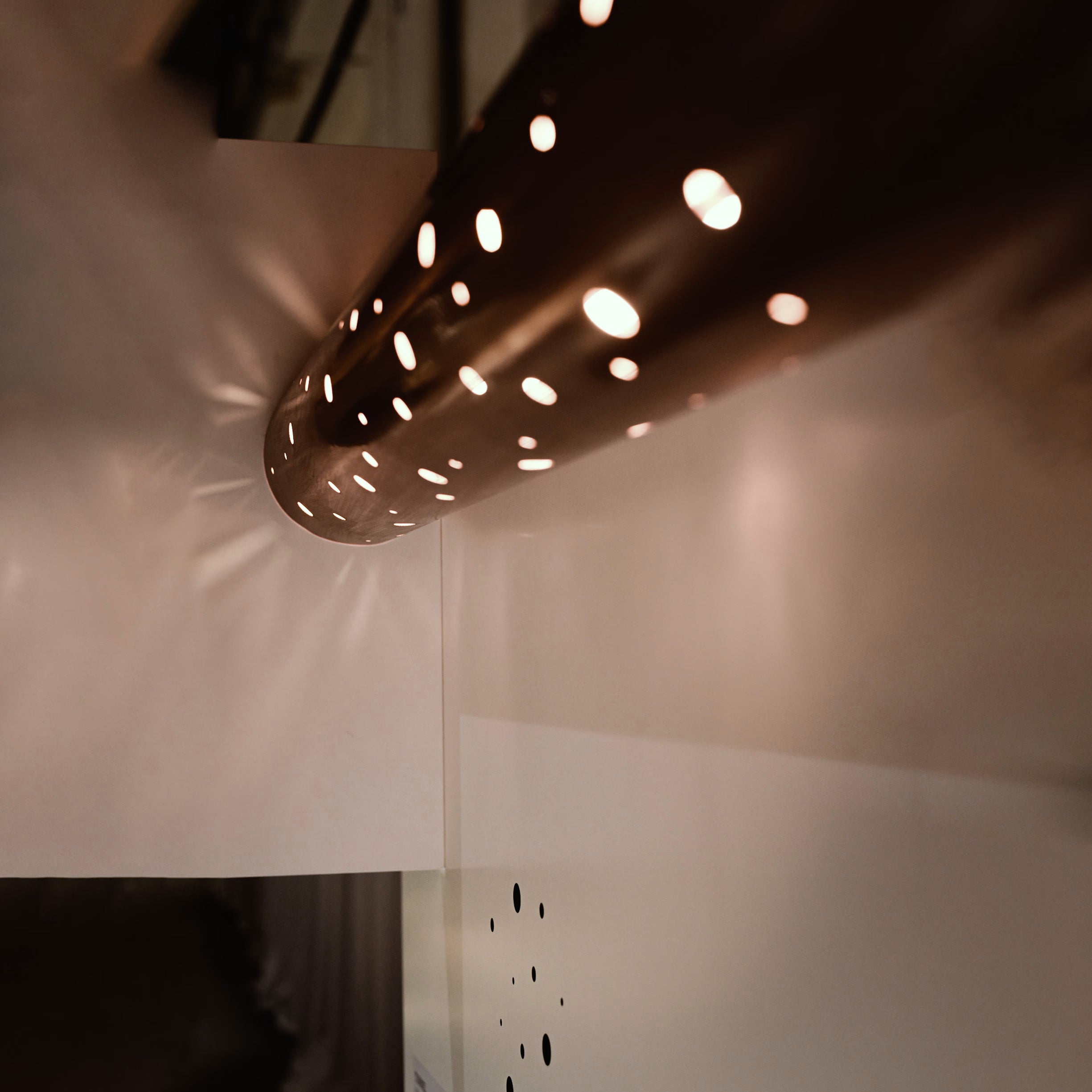 The light illuminates the metal tunnel from end to end, making its way through the cracks in the surface. The holes of varying diameters create a vibrant play of light projected into the room.