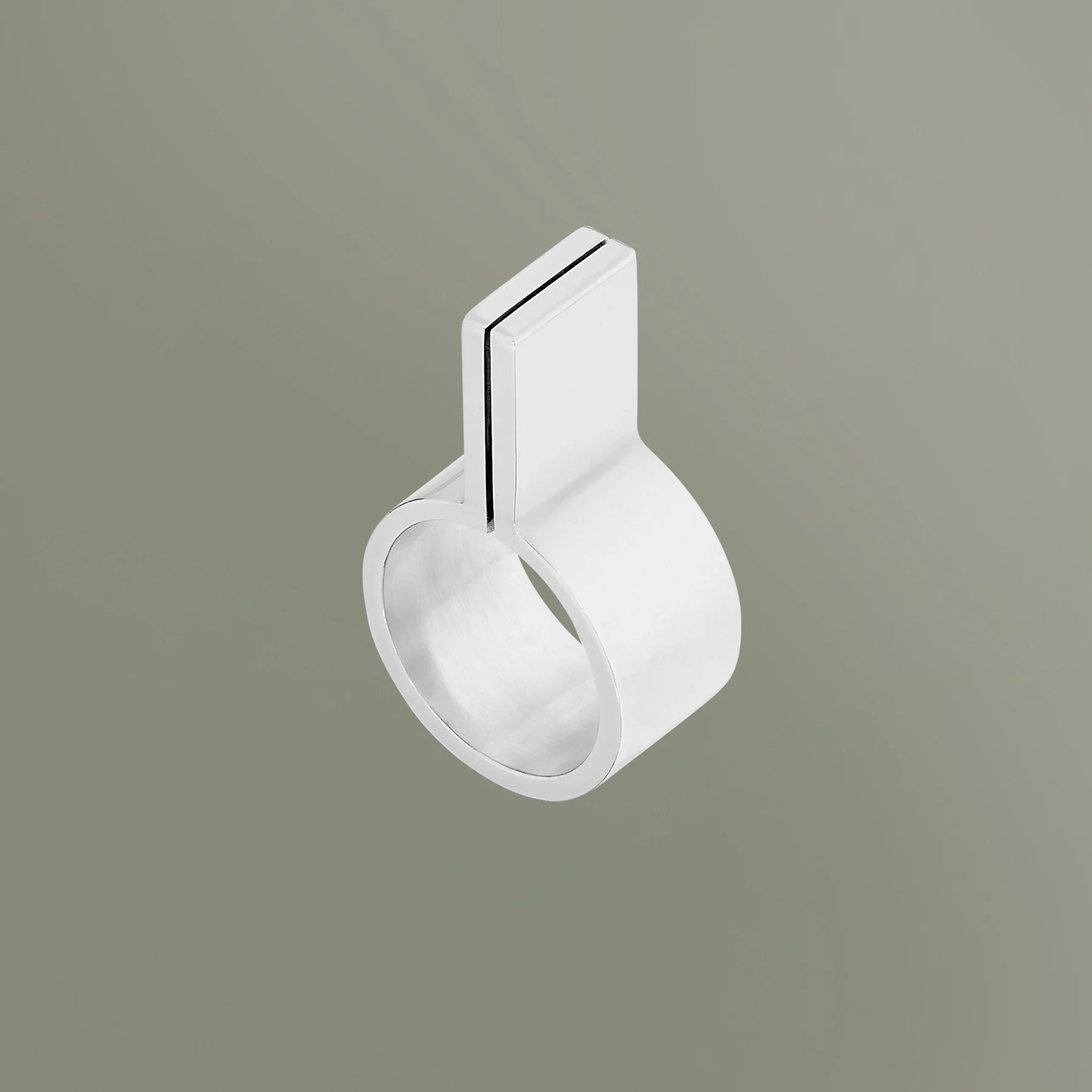 Lella e Massimo Vignelli hanno disegnato questo anello che richiama forme ancestrali. Come due monoliti che si ergono dal suolo, il gioiello è caratterizzato da due geometrie parallele realizzate in argento sterling.