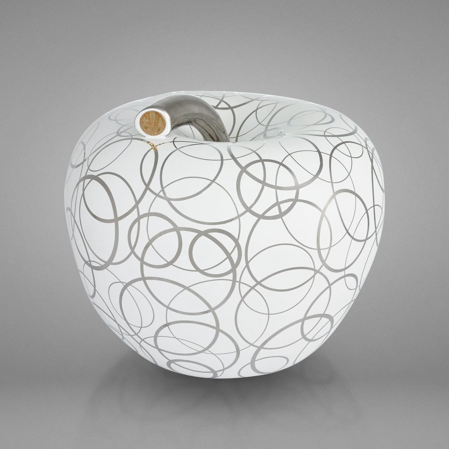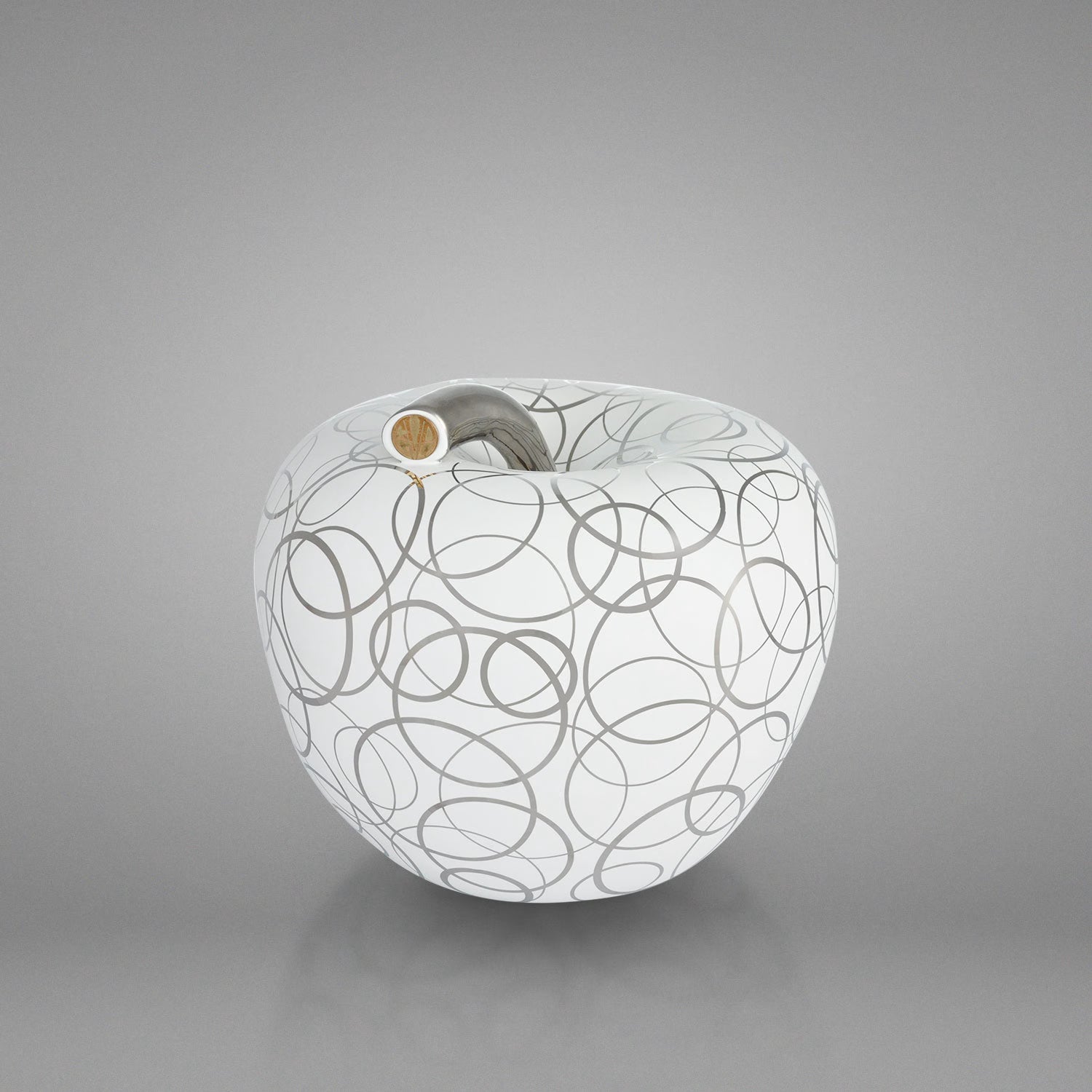 Salvadanaio a forma di mela, elegante oggetto di home decor con finitura in metallo prezioso platino ed esecuzioni manuali dell’artista.