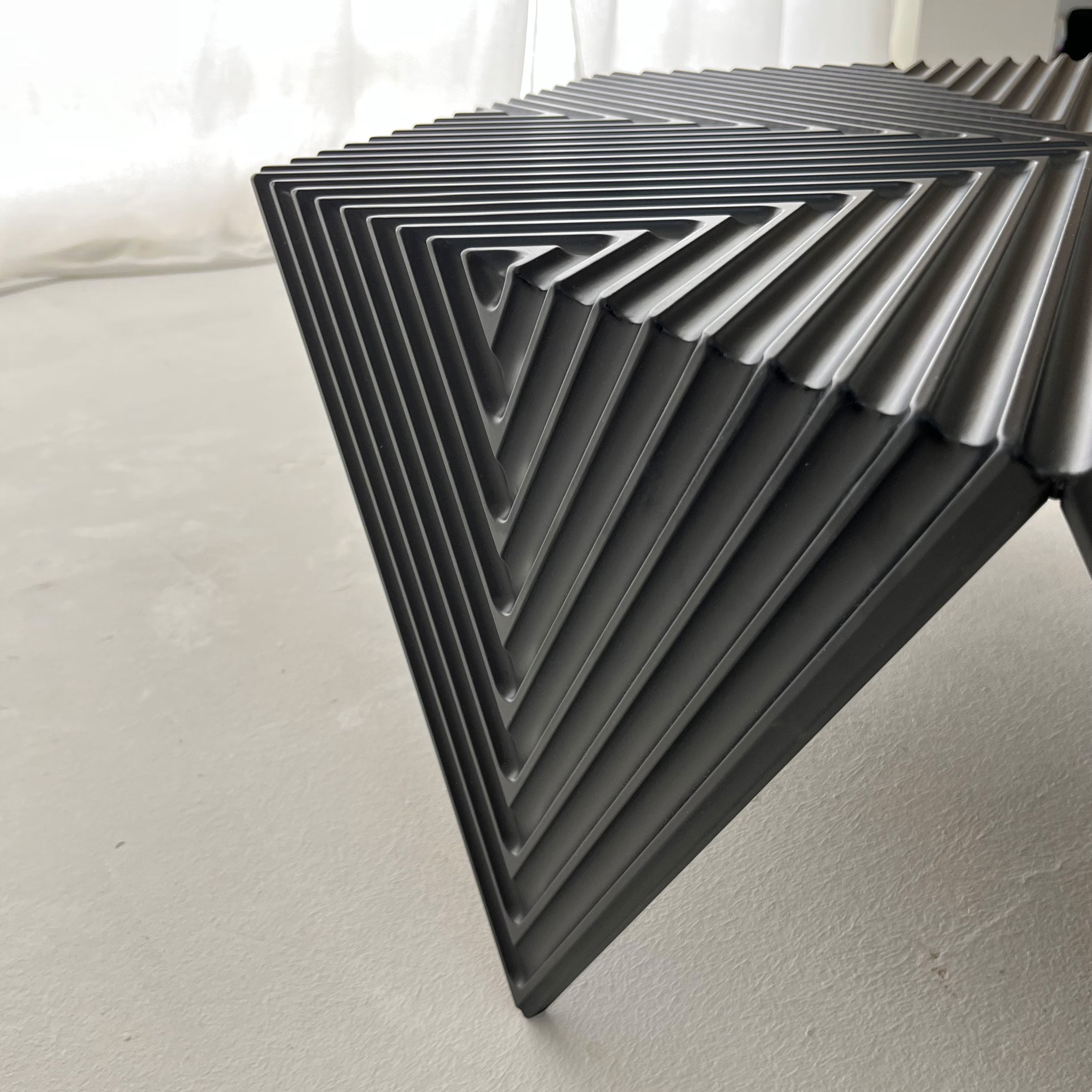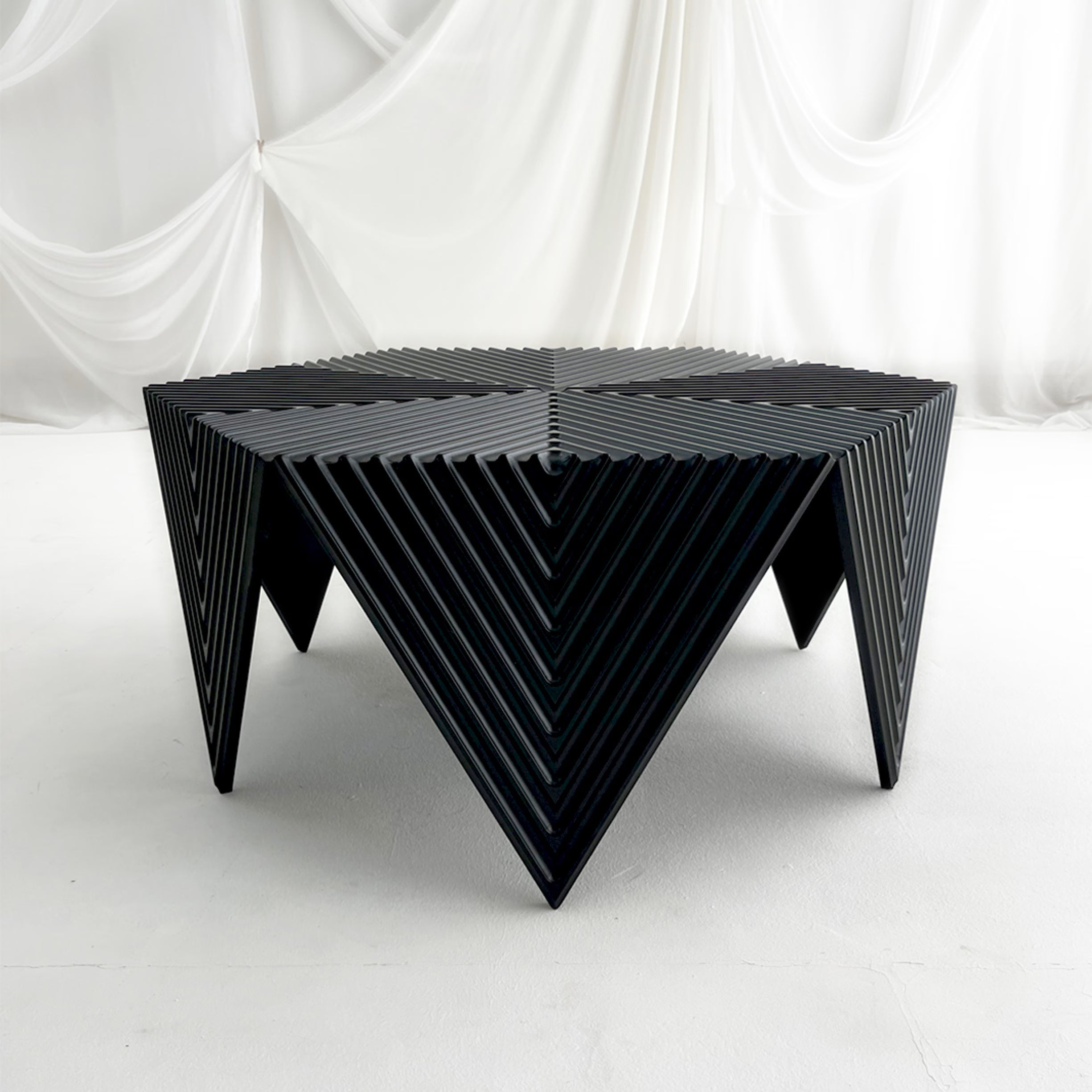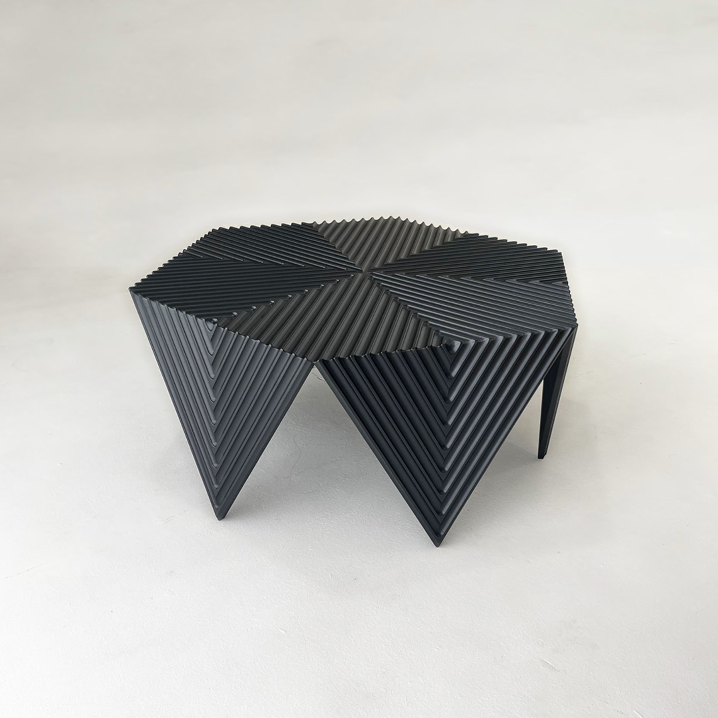 Il prodotto è realizzato interamente in MDF da 16 mm di spessore, lavorato tramite fresatura a controllo numerico per ottimizzare tempi e precisione di produzione. Il side table è composto da due elementi geometrici esagonali, uno utilizzato come piano d’appoggio, l’altro suddiviso in spicchi per formare la struttura dei piedi. Per la finitura è stata adottata una laccatura satinata.